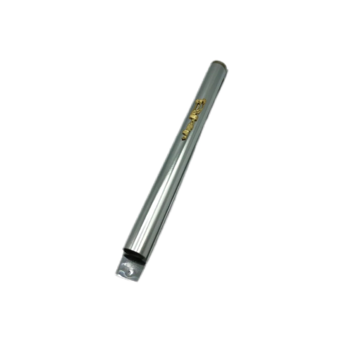 A beautifully designed silver mezuzah with gold detail on the front